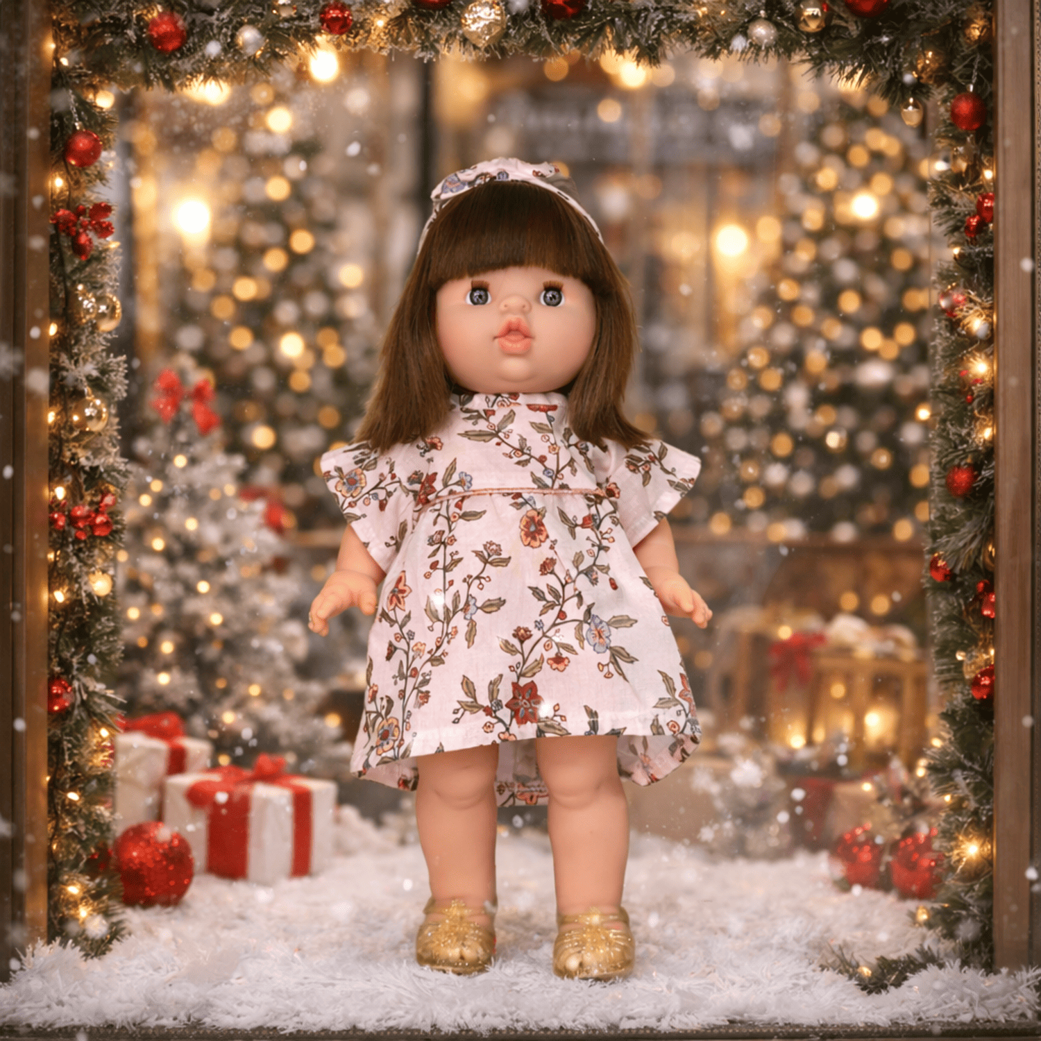 • Ținută inclusă: rochie cu imprimeu floral, pantofi aurii, bentiță