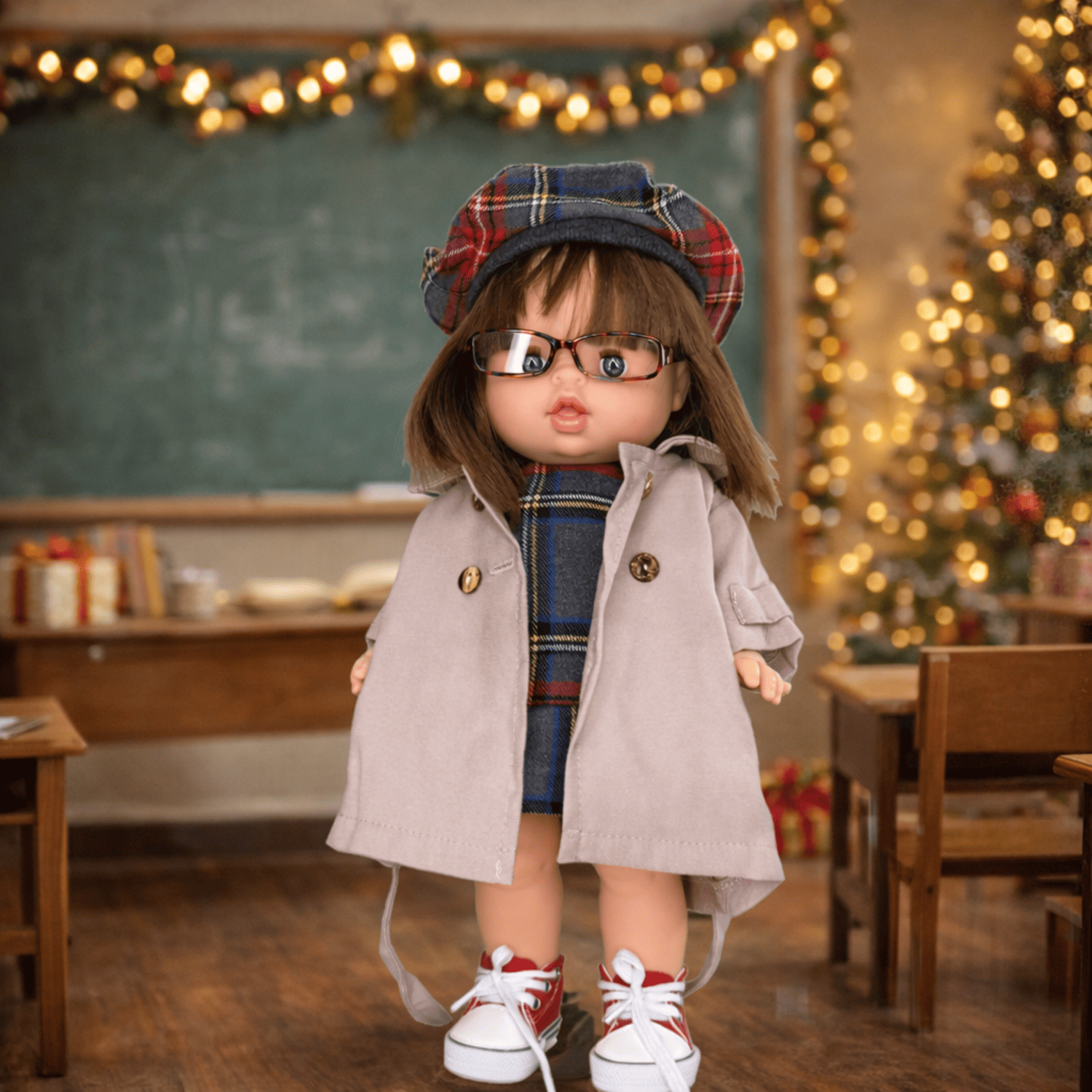 Această păpușă tip bebeluș Minikane este gata pentru o zi de joacă în stil școlăresc, purtând un palton bej, rochie în carouri și o beretă asortată. Încălțată cu adidași și accesorizată cu o pereche de ochelari, păpușa combină stilul clasic cu detalii moderne. Ideală pentru povești creative, scenarii de școală sau cadouri speciale, această păpușă adaugă varietate și personalitate în colecția de joacă a celor mici.