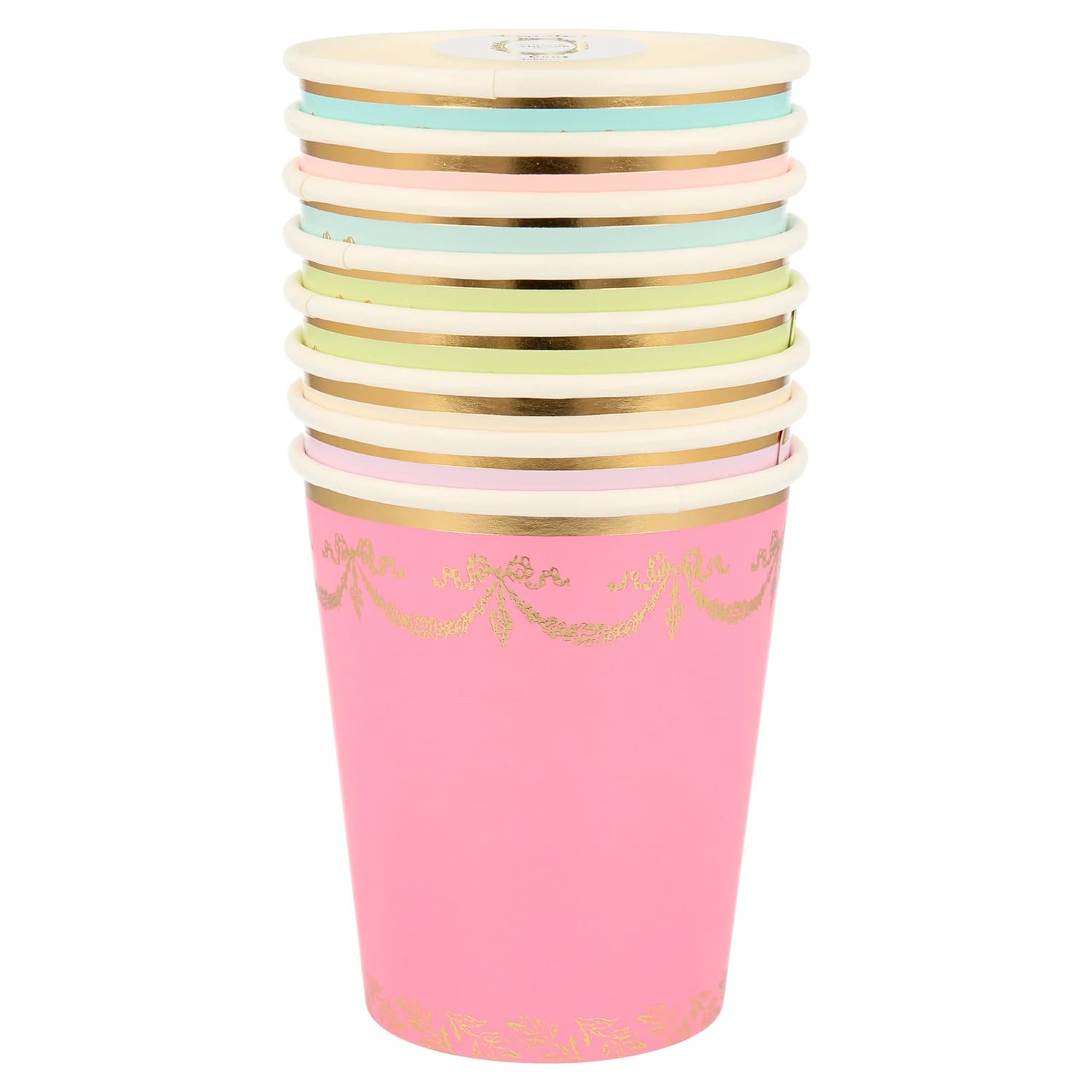 Aceste pahare elegante din carton fac parte din colecția Meri Meri x Ladurée și sunt inspirate de rafinamentul parizian. Cu un design pastel simplu și delicat, sunt ideale pentru petreceri elegante, brunch-uri sau evenimente festive cu decor floral și romantic.